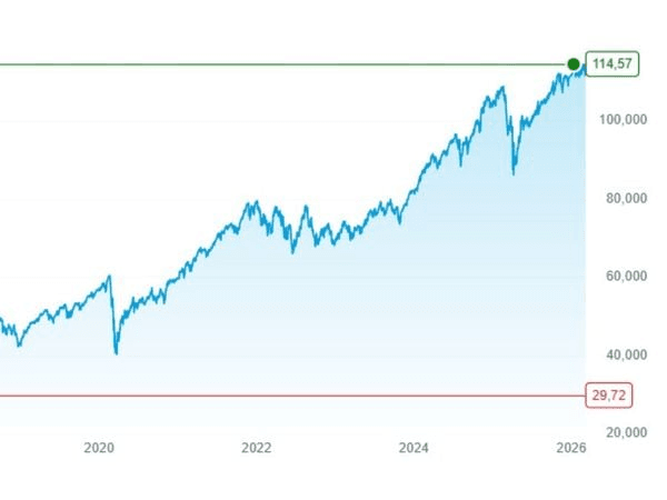 Screenshot van de koerswaarde van de ETF die Lizette voornamelijk koopt: „Vanaf begin februari 2020 zie je een duidelijke dip (start coronapandemie). Als je daar juist had gekocht, rond de 40 euro, dan was je investering nu bijna drie keer zoveel waard geweest. Hebben wij helaas niet gedaan, we hadden nog te weinig kennis en waren pas net begonnen. Maar zelfs met een maandelijkse inleg blijft het een stijgende lijn als je vergelijkt met de jaren ervoor. De jaren 2022-2024 waren wat wisselvallig, vanaf 2024 is er weer flinke groei geweest (maar ook weer met een behoorlijke dip in maart 2025). Toen hebben we wél extra gekocht, en dat levert nu mooi rendement op.”